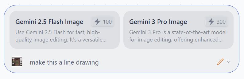 This seemed like a reasonable balance between discoverability: explaining what models do, and optionality: being able to choose the right model for your specific task. However the nested list UI required user’s to menu dive even for common tasks like editing images, and hid more advanced features behind toggles to avoid clutter. Furthermore, if a user did want to switch generative models they often found the model selection dropdown seriously intimidating. Instead of plain english descriptions of what models did, they suddenly faced a list of AI lab names with a lot of jargon with very little explanation. This was a major issue because we would always provide fast, cheap options in our defaults and these didn’t always produce quality results. A better model was just a click away, but we couldn’t easily convey this in our UI.