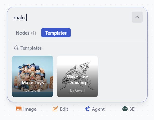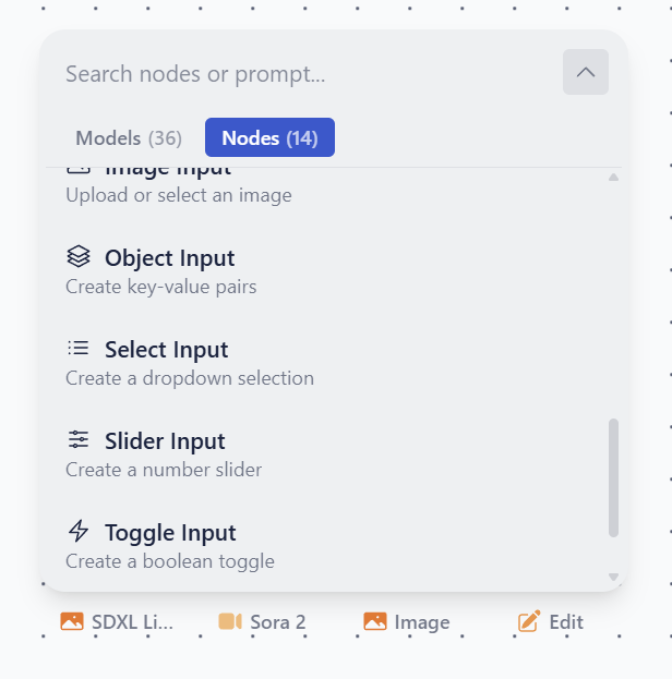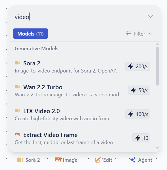 We are experimenting with showing a list of frequently used nodes and presets at the bottom of the search / prompt bar. These initialize to the four things people tend to use Runchat for, then show whatever you last used. If you need something else, you can search to filter models, tools and nodes. When you create a new node type, this gets added to the quick select list: