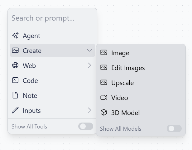 We’ve recently been trying to consolidate these three menus into a single UI element to reduce confusion around how to create nodes and configure models. The goal is to make the tool selection UI respond to the experience of the person using it. If you’re inexperienced with Runchat, it should suggest models and nodes for you and provide tooltips to explain what they do: