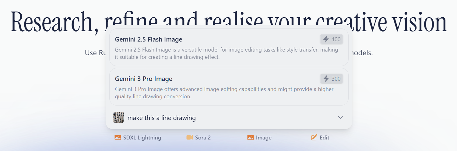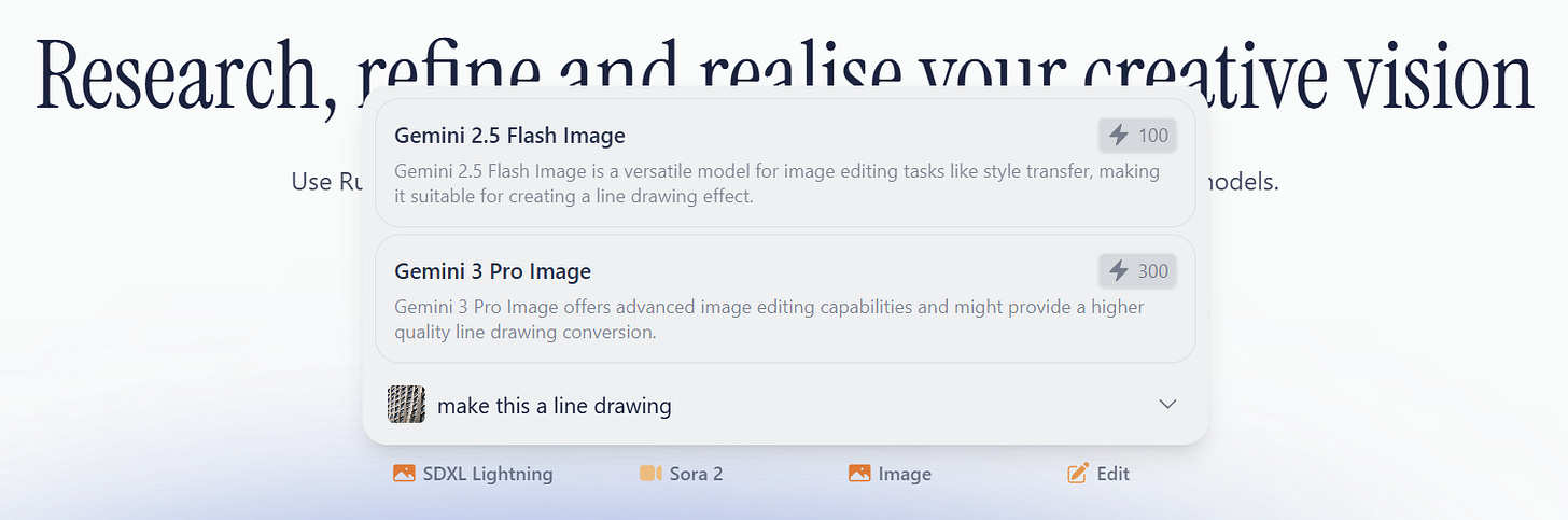 Runchat is a visual canvas for building creative workflows with generative models. For a product that fundamentally is about chaining these different models together to do creative work, helping people choose which model to use when is surprisingly difficult. The AI labs have made a habit of using nonsensical naming and versioning systems for their model releases. Models often use literal code names (e.g. NanoBanana), seemingly arbitrary semantic versioning and a litany of tags to identify different “versions”: Pro, Max, Dev, Flash, Turbo etc. Imagine using a sadistic version of photoshop where instead of having a single brush tool, you had to choose from a list that included new options like Brush Turbo, Brush 3.5 or NanoBrush every couple of weeks. What a nightmare.