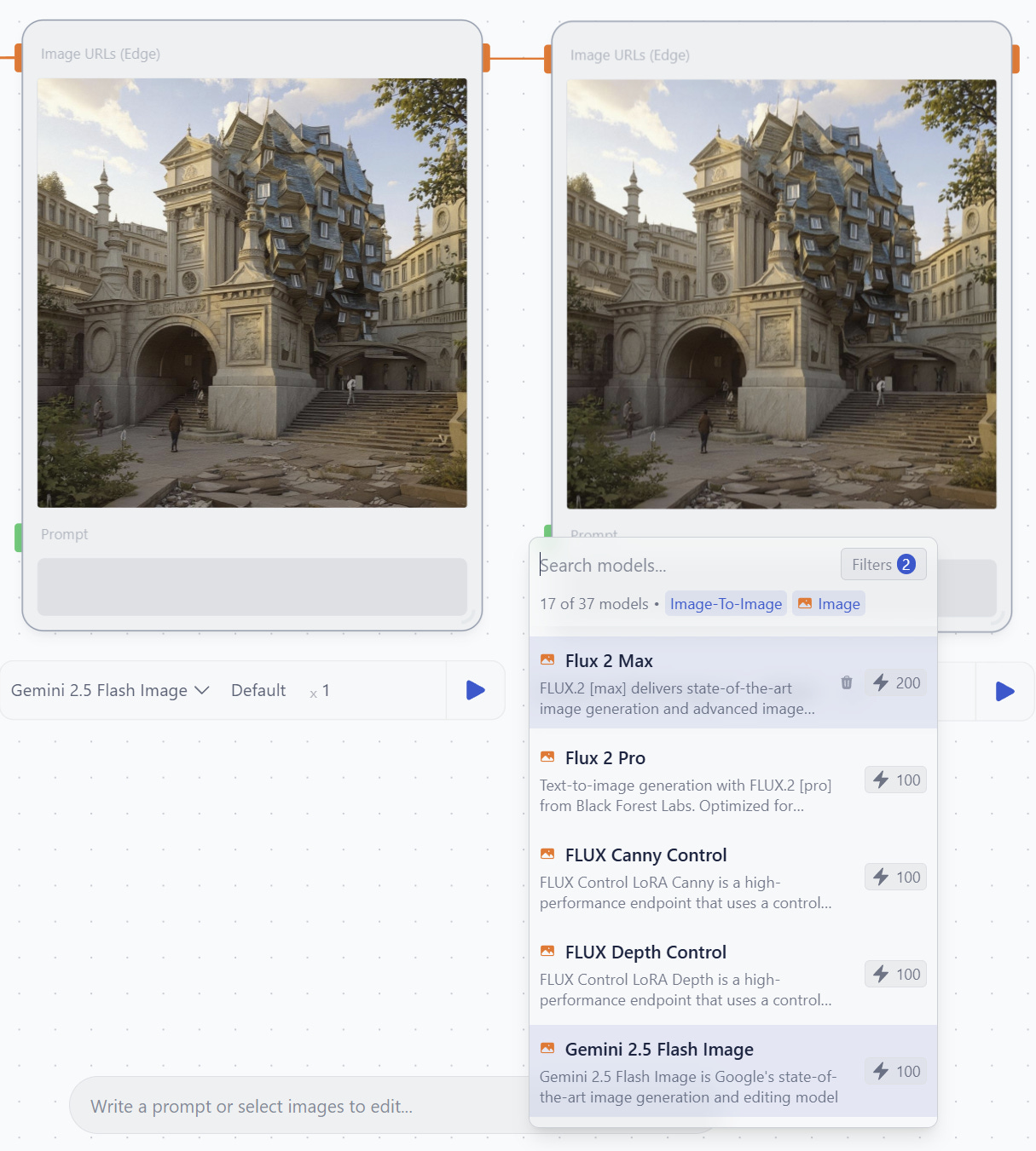 When Google released Gemini Flash Lite in late 2025 this opened the door to using an LLM to try to suggest models that would be appropriate for a user request. It was fast enough to generate responses in <2s, and reliable enough to take a long context with several examples and output JSON that we could use to build our UI. We added a permanent prompt bar to the bottom of the editor that would try to match the user’s prompt against some examples and choose two model options for quick or quality results. It was also provided with the context of selected nodes, and so could suggest image editing models more frequently if images were selected.
