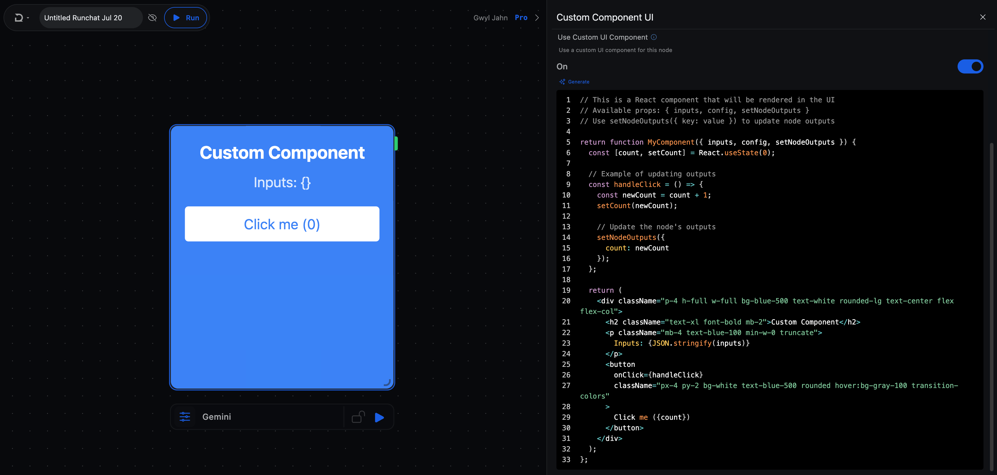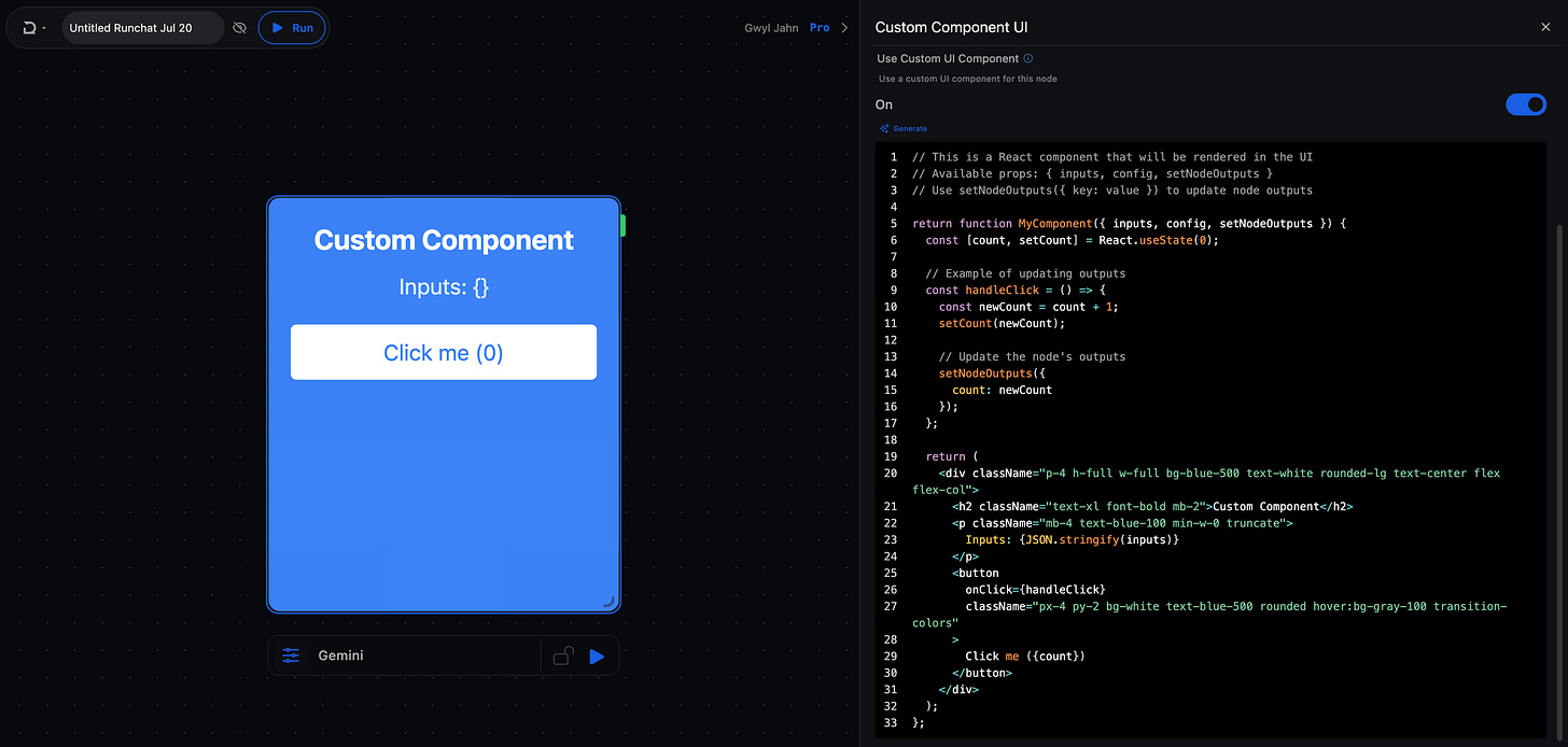 The goal of our generative UI is to make it as effortless and fast as possible for someone to fill in a gap in Runchat’s functionality and stay in creative flow. This means that it isn’t a great idea to force users to learn our API and then write custom components from scratch injavascript - no one would do this. Instead we want to lean heavily on language models to write all of our code, with users able to make changes by prompting the language model and seeing the result update immediately on the canvas. For more experienced developers it should be possible to make changes to the code directly, but we would hope that the requirement for this is kept to a minimum.