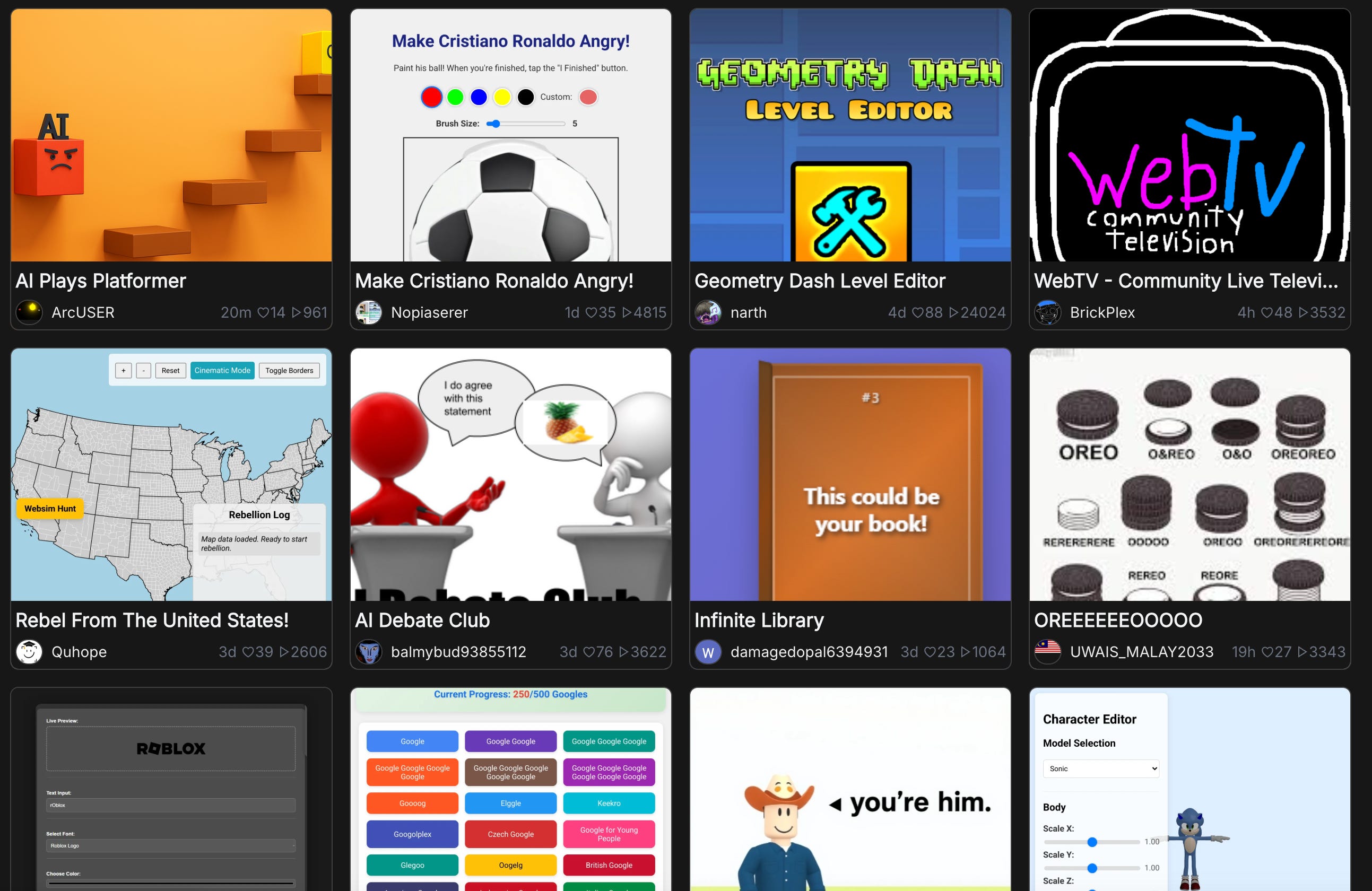 Digging around in websim feels like early Geocities internet. There is no visual consistency to anything, and comically atrocious pixelated images and jarring colour schemes abound. It also feels like a great place to pick up malware. You can’t really trust what any app does, and deception is almost part of the aesthetic. Some apps have links to “Free Robux” that speaks to the creator and target demographics. And this gets to the root of user-generated interfaces. It is an exciting and utopian idea to build software applications that allow their users to be maximally creative and bend the software itself to suit their needs. This is why kids are using websim. But this also makes it difficult or impossible to create a trustworthy brand and opens up all sorts of opportunities for sketchy behaviour when this user-generated content is shared on the internet and used by others.